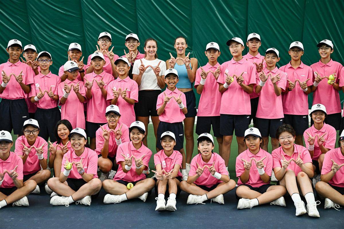 10月9日,在光谷国际网球中心明珠苑,武汉公开赛女双选手尼科尔斯和米希卡洛加与球童们合影,并做出“W”武汉公开赛手势。 (湖北日报全媒体记者 任勇 摄)
